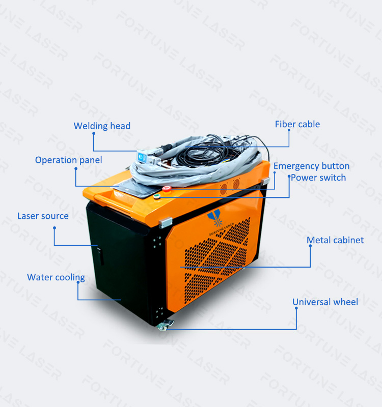 Fortunelaser hand-held fiber laser welding machine adopts the design of an integrated cabinet, which integrates the laser, chiller, software control, etc., and has the advantages of small footprint, convenient movement, and strong functionality.